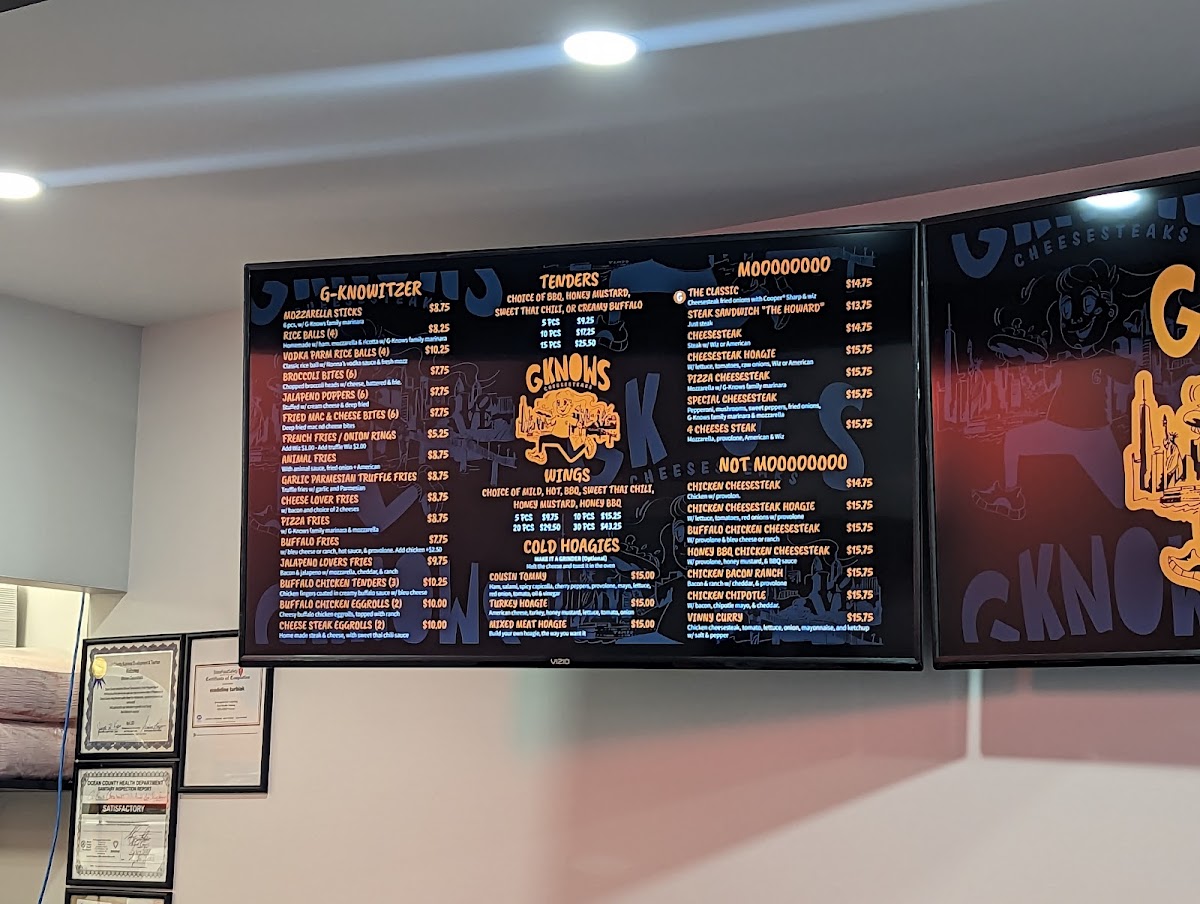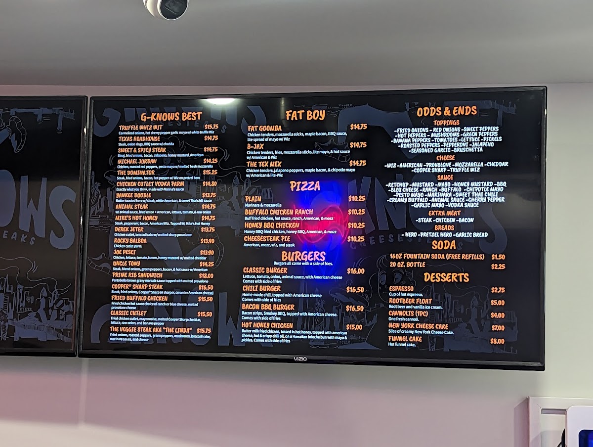 G's Cheesesteaks in Point Pleasant Beach offers a vibrant and diverse menu that caters to all tastes, featuring a variety of flavorful sandwiches, chicken dishes, and hearty sides. For a bold bite, try the Fat Boy options like the How Ya Doin!?! Boy or the Fat Goomba Boy, or go for the zesty Tex Mex Boy. The Joe Pesci Sandwich and Rocky Balboa Sandwich are standout choices in the G's Best section, while the Chicken Cutlet Vodka Parm Sandwich offers a savory twist. Sandwiches like the Michael Jordan Sandwich and the Dominator Sandwich are also top picks. Chicken lovers can enjoy different variations, such as the Chicken Bacon Ranch Cheesesteak or the Buffalo Chicken Cheesesteak, with other options like the Chicken Cheesesteak Hoagie and Honey BBQ Chicken Cheesesteak. For a tasty appetizer, don't miss the Pizza Fries or the crunchy Cheesesteak Egg Rolls, alongside a side of Garlic Parmesan Truffle Fries or Buffalo Chicken Tenders. The burger menu includes the Classic Burger, Bacon BBQ Burger, and the unique Smash Burger. You can also enjoy crispy Wings to complement any meal. To wash it all down, choose from a variety of beverages like 20oz Diet Coke, 20oz Coke, or a refreshing 20oz Sprite. For larger gatherings, the G-Pack catering option offers a great way to share the delicious experience. The cheesesteak selection, including the Mikes Hot Honey Cheesesteak and the Pizza Cheesesteak, is a must-try for fans of the classic sandwich. G's Cheesesteaks truly delivers a menu filled with mouthwatering options that will satisfy any craving.